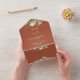 Invitación de boda todo en uno con hermosa vegetación floral, tipografía elegante y monogramas iniciales sobre fondo de terracota. La invitación incluye una tarjeta de RSVP perforada con el código QR del sitio web de su boda. Diseñado por Thisisnotme©