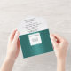 Una bonita y sofisticada bodega al aire libre, con acuarela, todo en uno, ofrece una villa toscana en un viñedo que tiene filas de viñas de uva que se extienden delante y racimos rojos de uvas en viñas. A lo lejos, en una pequeña colina, aparecen árboles de álamo. Esta imagen panorámica del paisaje italiano se encuentra sobre una tira de lágrimas en la que otra villa toscana en una bodega aparece encima de una tira de lágrimas verde azul verde azulado. Si se casa en Italia en la Toscana, esta invitación amigable con el presupuesto es ideal para la pareja discerniente que quiere destacar.