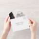 El borde izquierdo de esta elegante y moderna invitación a la boda todo en uno y RSVP cuenta con un borde de batida de color negro con falso purpurina de oro. La superposición de texto negro de personalizable combina la escritura a mano gris carbón, la copperplate y las fuentes cursivas sobre una foto de su elección, suavizada con un filtro blanco para resaltar el texto. La dirección de retorno aparece en la solapa exterior y en el reverso de la tarjeta RSVP desmontable.
