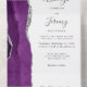 El borde izquierdo de esta elegante y moderna invitación a la boda todo en uno y RSVP cuenta con un borde de ágata color morado con falso purpurina plateado. El texto del personalizable combina la escritura a mano de carbón gris, el copperplate y las fuentes cursivas en un fondo blanco. La dirección de retorno aparece en la solapa exterior y en el reverso de la tarjeta RSVP desmontable.