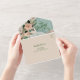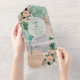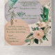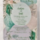 Esta tarjeta de invitación a la boda presenta un diseño elegante y moderno de moda boho con una suave paleta de colores pastel de verdes, azules y rosa. El fondo está adornado con flores de acuarela, entre ellas rosas y follaje arbolado, que crean un ambiente romántico y delicado. El texto está escrito en una combinación de fuentes clásicas de escritura serif y caligráfica, añadiendo un toque de sofisticación y gracia. La tarjeta incluye todos los detalles esenciales para el evento, como la fecha, la ubicación, las opciones de RSVP, y las preferencias de las comidas, todo ello organizado en un diseño circular que atrae la atención suavemente a través del diseño. Todo esto en un diseño hace que enviar invitaciones y rsvps sea mucho más sencillo. Personalice el texto con su información.