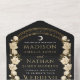 Captura la elegancia intemporal con esta invitación de estilo Art Nouveau Celestial con tu propio código QR! Con un arco dorado radiante, flores blancas delicadas y estrellas brillantes sobre un fondo negro, este diseño marca la pauta para una celebración sofisticada. ¡Ideal para bodas, galas y eventos históricos! Tenga en cuenta que el oro de este producto NO es un Relieve metalizado real; se imprime sin formato.