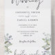 Invitación de boda todo en uno con vegetación floral y tipografía elegante. La invitación incluye una tarjeta RSVP perforada que incluye el código QR de su sitio web boda. Diseñado por Thisisnotme©