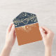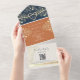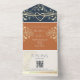Moda y práctica, esta invitación a la boda todo en uno en terracota presenta elegantes acentos florales de oro, un monograma sobre una solapa marina y un moderno código QR para RSVP. El formato plegado combina la invitación, la sección de respuesta y los detalles del invitado en una pieza conveniente, sin necesidad de sobre. Perfecto para bodas rústicos de boho, celebraciones al aire libre de verano o temas románticos modernos. Personalice con facilidad los nombres, la fecha, el sitio web y las opciones de respuesta. Por favor, tenga en cuenta que esta invitación "todo en uno" requiere un sobre separado para el envío de correo. Recomendamos emparejarlo con un sobre A9 estándar (5,75" x 8,75") para el mejor ajuste.