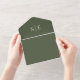 Esta moda minimalista invitación a la boda todo en uno puede ser personalizada con sus iniciales de monograma e información sobre el día de la boda en un entorno verde oliva. La invitación incluye un RSVP perforado con el código QR de su sitio web boda y detalles. Diseñado por Thisisnotme©