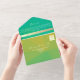 Audaz y vibrante, esta contemporánea invitación a una boda verde en uno presenta un fondo geométrico dinámico, un ilustracion cardíaco de cuerda dorada y una elegante tipografía moderna. Diseñado para su comodidad, este formato plegado incluye una tarjeta postal RSVP perforada y espacio adicional para los detalles del boda, sin necesidad de sobres. Perfecto para bodas modernas, ecológicas o de destino. Personalizable completo con sus nombres, fecha e información de celebración. Por favor, tenga en cuenta que esta invitación "todo en uno" requiere un sobre separado para el envío de correo. Recomendamos emparejarlo con un sobre A9 estándar (5,75" x 8,75") para el mejor ajuste.