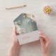Esta suite boda, con sus flores exuberantes y dramáticas, de color blanco cremoso a rosa rubor, sus toques dorados y sus hermosos fondos acuáticos, crea un ambiente elegante y romántico, que da un toque de lo que los clientes pueden esperar en su gran día. Esta llamativa invitación "todo en uno" y RSVP, en un fondo de verde español, proporciona una plantilla para añadir fácilmente sus detalles de evento en un texto de oro de lujo. Busque ID1022 para ver todos los productos de este conjunto de bodas.