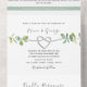 Celebre su gran día con esta elegante y moderna invitación de boda boho todo en uno que presenta ramas de eucalipto pintadas a mano y un motivo de corazón plateado minimalista. El acento suave en verde salvia y el follaje de acuarela aportan un encanto natural y tranquilo a su suite de papelería, perfecto para bodas en el jardín, celebraciones de primavera o verano, o temas botánicos modernos. Incluye sección de RSVP y panel de sobre de devolución, fácil de personalizar y listo para enviar.