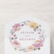 Colores de agua románticas florales en malva, rosa polvoriento, coral y amarillo, con escritura moderna a la moda, elegante y romántico, ideal para boda moderno, boda romántico y bodas en el jardín botánico en primavera, verano y otoño. Vea todas las piezas coincidentes de la colección.