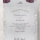 Un fondo falso plateado, decorado con flores borgoñas y rosas, con destellos de plata. Personalice y agregue sus nombres, monogramas y detalles del boda. Letras de color negro.