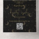Esta invitación de boda de foto negra y dorada todo en uno presenta una tipografía elegante sobre un fondo celestial de luna y estrellas. La invitación incluye una tarjeta de RSVP perforada con el código QR del sitio web de su boda. Diseñado por Thisisnotme