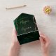 Esta elegante y moderna invitación a la boda se caracteriza por una acuarela de color verde esmeralda recortada con un falso purpurina de oro. El texto del personalizable combina la escritura a mano moderna de color dorado, el copperplate y las tipografías cursivas. La dirección de retorno aparece en la solapa exterior y en el reverso de la tarjeta RSVP desmontable en texto de color dorado sobre un fondo verde oscuro.