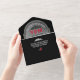 Invitaciones de boda de Halloween de lápida gótica que incluyen la información de la boda y tarjeta postal de respuesta que sus invitados arrancan y envían. No se necesitan sobres. Cuenta con una lápida de granito agrietada, manos de esqueleto y corazón, rosas rojas y cráneo alado gótico en colores rojo, negro y blanco. Gran ambiente victoriano. ¡Perfecto para la pareja que se casa en Halloween o el día de los muertos!