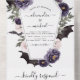 Halloween 31 de octubre otoño color de agua oscuro morado y boda verde invitaciones sobre fondo negro - incluye tipografía de escritura aterradora y escalofriante y elegante con flores modernas y alas murales para la celebración especial del Día de la Boda Sombrerosa.