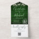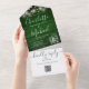 Toda en una invitación a la boda con luces de cuerdas de bonito, jarras de albañil, nombres de estilo y tipografía de moda en un fondo rústico de madera esmeralda verde. La invitación incluye una tarjeta RSVP perforada con un código QR. Diseñado por Thisisnotme©