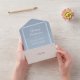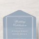 Todo en una invitación de boda con tipografía elegante e iniciales de monograma sobre un polvoriento fondo azul. La invitación incluye una tarjeta RSVP perforada que puede ser dirigida individualmente o dejada en blanco para que usted escriba a mano los detalles de la dirección de su invitado. Diseñado por Thisisnotme©