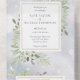 Todo ello en una invitación a la boda con elegantes hojas de color agua botánica y un borde de marco dorado de moda sobre un fondo de copos de nieve de invierno. La invitación incluye una tarjeta RSVP perforada que puede ser dirigida individualmente o dejada en blanco para que pueda escribir a mano los detalles de la dirección de su invitado. Diseñado por Thisisnotme©