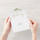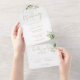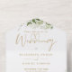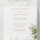 Invitación de boda todo en uno que incluye vegetación botánica, hojas rústicas y tipografía dorada elegante. La invitación incluye una tarjeta de RSVP perforada que puede ser dirigida individualmente o dejada en blanco para que escriba a mano los detalles de la dirección de sus invitados. Diseñado por Thisisnotme