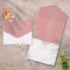 Invitación de boda todo en uno con una guirnalda floral de laurel decorativa y borde dorado que contiene las iniciales de tu monograma en un fondo de rosa polvoriento. La invitación incluye una tarjeta de RSVP perforada que se puede dirigir individualmente o dejar en blanco para que escribas a mano los detalles de la dirección de tus invitados. Diseñado por Thisisnotme