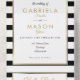 Todo en una invitación de boda con elegantes tipografías de oro y negro y iniciales de monograma con un fondo rayado en blanco y negro. La invitación incluye una tarjeta RSVP perforada que puede ser dirigida individualmente o dejada en blanco para que usted escriba a mano los detalles de la dirección de su invitado. Diseñado por Thisisnotme©