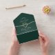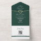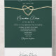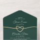 Elegante y moderna invitación todo en uno de color verde esmeralda y dorado, con un diseño minimalista y un acento de corazón dorado de moda. Este sello y invitación ecológica es perfecto para una sofisticada boda de otoño o invierno. Incluye detalles de RSVP con un código QR para una respuesta fácil de los clientes. Personaliza el texto para que coincida con tu día especial.