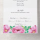 Un bonito diseño floral con rosas rosas rosas rosas y vegetación en una sola invitación a la boda. Sus huéspedes pueden sacar la tarjeta RSVP y enviarla de vuelta. Todos los campos son editables.