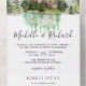 Disfrute de una elegante boda con el tema de la selva acuática, con una hermosa cabaña en medio de montañas y pinos sobre un fondo blanco con una tarjeta postal RSVP. Simplemente agregue los detalles de su evento en esta plantilla fácil de usar para convertirla en una invitación única.