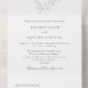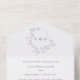 Una elegante y tradicional invitación a la boda todo en uno con un escudo escudo con hojas en gris claro con tu monograma en el centro. Los motivos de las hojas están dispersos por todo el diseño, con una útil sección de desgarros de rsvp. Personaliza tus datos en texto gris.