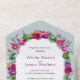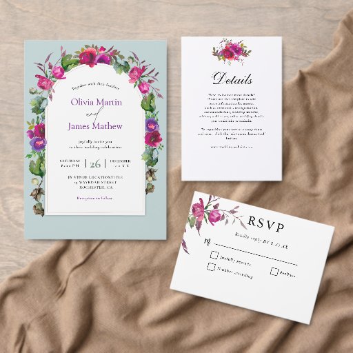 Elegante moda color púrpura rosa color arco marco invitación a la boda. Haga una declaración con esta invitación todo en uno boda de marco de arco color rosa y púrpura con esta moda. Diseñado con suaves y artísticas flores acuáticas en elegantes tonos rosa y violeta, esta invitación se caracteriza por un elegante marco de estilo arco que le aporta un toque moderno y romántico. El diseño "todo en uno" incluye todos los detalles esenciales del boda en un diseño impecable y sofisticado, lo que lo hace práctico y hermoso. Perfecto para bodas contemporáneos, de jardín o clásicos, esta invitación marca el tono para una celebración elegante e inolvidable.