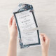 Haga una primera impresión impresionante con esta elegante invitación de boda todo en uno. Con un lujoso marco de mármol azul acentuado por las suaves flores acuáticas, el hotel desprende sofisticación y encanto. El área de texto del personalizable muestra los detalles de su boda en elegantes letras serif y un guión elegante, creando un aspecto atemporal y romántico. Perfecto para temas modernos o clásicos, esta invitación captura con gusto la esencia de su día especial.