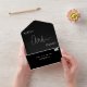 Esta elegante invitación de boda en blanco y negro es perfecta para una boda moderna. el diseño simple presenta caligrafía blanca elegante sobre un fondo negro.