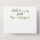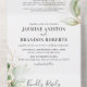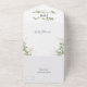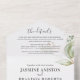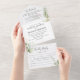 Elegante invitación de boda trifold 3 en 1 con follaje verde de acuarela botánica, acentos de brillo dorado, detalles de su boda, una invitación de boda y una tarjeta postal de entrada de comida rsvp para que sus invitados la arranquen y la devuelvan.