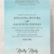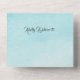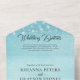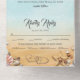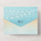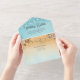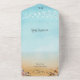 Invitación tripartita de boda en destino de playa que incluye un fondo rústico con gradiente de amarillo a azul acuarela, estrella de mar, conchas marinas, luces de cuerda, dos corazones en la arena con tus iniciales, detalles de la boda, invitación de boda y una tarjeta postal de menú y respuesta para que tus invitados la arranquen y la envíen de vuelta.