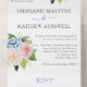 Estas invitaciones nupciales presentan un moderno diseño floral acuático con hortensias azules, peonías onduladas, rosas rosas rosas rosas y follaje verde. Personaliza tu texto. También se dispone de material de papelería de correspondencia.