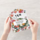 Invitaciones de boda florales de maestro holandés todo en uno que incluyen la información de la boda y la tarjeta postal de RSVP que sus invitados arrancan y envían. No se necesitan sobres. Cuenta con flores brillantes y audaces.