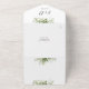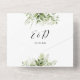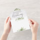 Invitación de boda todo en uno que incluye los nombres de los padres, vegetación botánica rústica y tipografía elegante. La invitación incluye una tarjeta de RSVP perforada con un código QR. Diseñado por Thisisnotme©