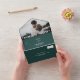 Moderna audaz y minimalistas iniciales casuales boda de fotos, pequeña ceremonia de boda perfecta. Añade tus fotos e iniciales de tu pareja , un sencillo tema de boda verde de los bosques blancos y oscuros.Todo en una sola invitación de boda, agrega tus detalles, rsvp.