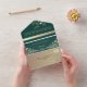 Elegante invitación de boda todo en uno en verde esmeralda con acentos florales de oro y un romántico monograma de corazón de cuerda. El diseño incluye espacio para los detalles del boda, una tarjeta RSVP desmontable y una foto de vuelta personalizada. Tenga en cuenta que esta invitación no se envía por correo y requiere un sobre A9. Una elección moderna y coordinada para las parejas que deseen un estilo y una comodidad en una sola tarjeta.
