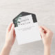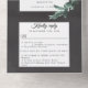 Todo en una invitación a una boda triplemente repartida con Eucalyptus sobre un fondo canario de carbón vegetal. Invitación a la boda, tarjeta rsvp y combinación de sobres. La tarjeta de respuesta es una tarjeta rsvp perforada con opciones de comida detalladas. Una solución moderna, todo en una sola solución, para evitar que la tarjeta rsvp adjunta termine accidentalmente debajo de la nevera.