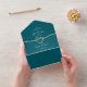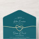 Crea una impresión impresionante con esta elegante invitación de boda todo en uno de color verde turquesa. Con un diseño minimalista que incluye un delicado acento de corazón dorado romántico y tipografía limpia, esta invitación ecológica con sello y envío es perfecta para bodas modernas. Los invitados pueden responder fácilmente utilizando el código QR incluido. Ideal para parejas que buscan una solución de invitación elegante, conveniente y ecológica.
