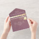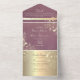 Elegante, vintage, púrpura invitación a la boda todo en uno con encaje floral dorado, monograma en la parte superior, guión moderno de caligrafía e imagen de la pareja. Añade tu foto, detalles del boda y rsvp.