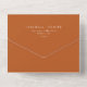 Una invitación nupcial moderna, todo en un solo monograma, incluye una elegante tarjeta naranja quemada con tipografía blanca clásica. Esta invitación es perfecta para aquellos que desean una boda simple y elegante. Sus invitados simplemente desgarran el RSVP que ha sido preimpreso con su dirección de retorno y envíelo de vuelta. Puedes escribir a mano el nombre de tu invitado y la dirección de correo en la parte delantera de la tarjeta
