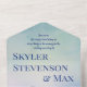 Todo en una invitación a la boda con un hermoso y sereno paisaje en tonos de verde marino, azul y violeta como fondo. Añade los nombres de la pareja feliz con una gran fuente azul profundo.
