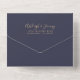 El borde izquierdo de esta elegante y moderna invitación a la boda todo en uno y el RSVP cuenta con un purpurina de imitación dorado. El texto del personalizable combina la escritura manual caprichosa de color dorado, el copperplate y las fuentes cursivas en un fondo azul oscuro. La dirección de retorno aparece en la solapa exterior y en el reverso de la tarjeta RSVP desmontable en texto de color dorado sobre azul oscuro sólido.