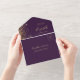 El borde izquierdo de esta elegante y moderna invitación a la boda todo en uno y el RSVP cuenta con un purpurina de imitación dorado. El texto del personalizable combina la escritura manual caprichosa de color dorado, el copperplate y las fuentes cursivas sobre un fondo morado oscuro. La dirección de retorno aparece en la solapa exterior y en el reverso de la tarjeta RSVP desmontable en texto de color dorado sobre púrpura sólido.