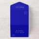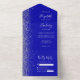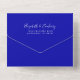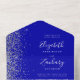 El borde izquierdo de esta elegante y moderna invitación a la boda todo en uno y RSVP cuenta con un falso borde purpurina plateado. El texto del personalizable combina la escritura a mano blanca y caprichosa, el copperplate y las fuentes cursivas sobre un fondo azul real. La dirección de retorno aparece en la solapa exterior y en el reverso de la tarjeta RSVP desmontable en texto blanco sobre azul real sólido.