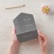 El borde izquierdo de esta elegante y moderna invitación a la boda todo en uno y RSVP cuenta con un falso borde purpurina plateado. El texto del personalizable combina la escritura manual caprichosa de color gris plateado, el copperplate y las fuentes cursivas en un fondo gris. La dirección de retorno aparece en la solapa exterior y en el reverso de la tarjeta RSVP desmontable en texto gris plateado sobre gris sólido.