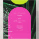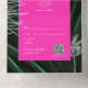 Arcos de color amarillo neón y rosa sobre fondo de hojas de palma oscuras con monograma sobre arco amarillo. Ilustracion de hojas de palma blanca a la izquierda y ilustracion de palmera a la derecha en la tarjeta R.S.V.P. R.S.V.P. incluye código QR para reemplazarlo por el suyo propio. Afuera es de color amarillo neón con texto negro que incluye dirección de retorno (solapa superior), guión "entregar" (centro) y dirección en la parte inferior (parte posterior de rsvp).
