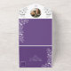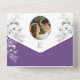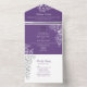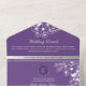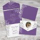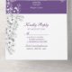 Celebre el romance atemporal con esta invitación a la boda todo en uno, inspirada en la vintage, con un rico fondo morado y un moderno encaje floral de boho blanco y plateado. Elegante y encantador, este diseño combina el encanto vintage con la sofisticación moderna, perfecta para bodas románticos, boho o clásicos. Personalizar con sus iniciales favoritas de fotos y monogramas para hacerlo único suyo. Incluye espacio para tu sitio web boda y detalles de RSVP, haciéndolo tan práctico como hermoso. Una moda e inolvidable manera de compartir tu historia de amor. Por favor, tenga en cuenta que esta invitación "todo en uno" requiere un sobre separado para el envío de correo. Recomendamos emparejarlo con un sobre A9 estándar (5,75" x 8,75") para el mejor ajuste.