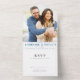 Anuncie a su boda con estilo con esta romántica y moderna invitación RSVP todo en uno y diseñado para poner su feliz retrato de pareja en el corazón de la celebración. Esta elegante tarjeta presenta su foto completa favorita junto con una presentación cálida y personal, con un diseño limpio y minimalista y alegres notas de texto azul que le dan un toque de encanto contemporáneo. Sus nombres aparecen de forma prominente en escritura moderna clásica y tipografía de serif, acompañados de todos los detalles esenciales del evento: lugares de ceremonia y recepción, fecha especial y una dirección de retorno claramente marcada para el rastreo sin esfuerzo de RSVP. La sección de retroceso o desgarro está dedicada a las respuestas de RSVP, haciendo que las respuestas de los invitados sean simples y fáciles. Perfecto para parejas que buscan una mezcla de romance, personalización y elegancia moderna, esta invitación marca el tono para un evento memorable que combina información práctica con estilo sofisticado.